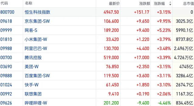盘面上,今日大型科网股集体回暖,京东绩后涨近10%,网易、小米、阿里巴巴、腾讯、美团均跟涨超3%以上。