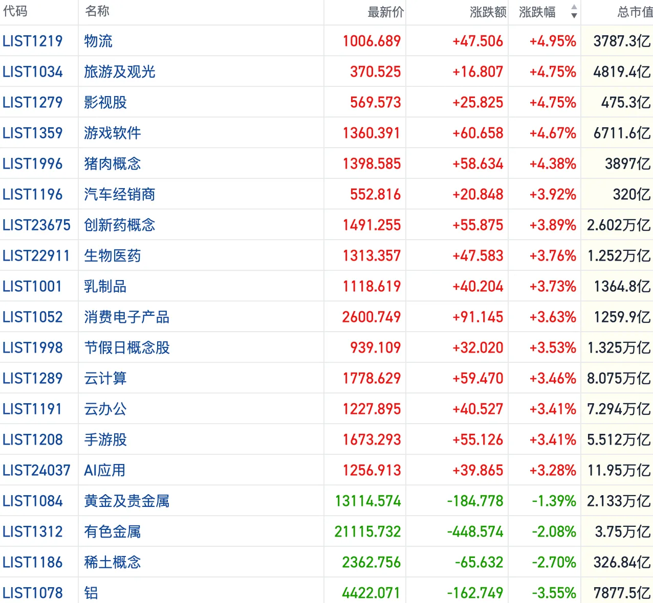 其他方向上,创新药、AI、算力等成长赛道短线强势。此外,汽车、地产、石油、餐饮、地产等传统行业也有所走强。