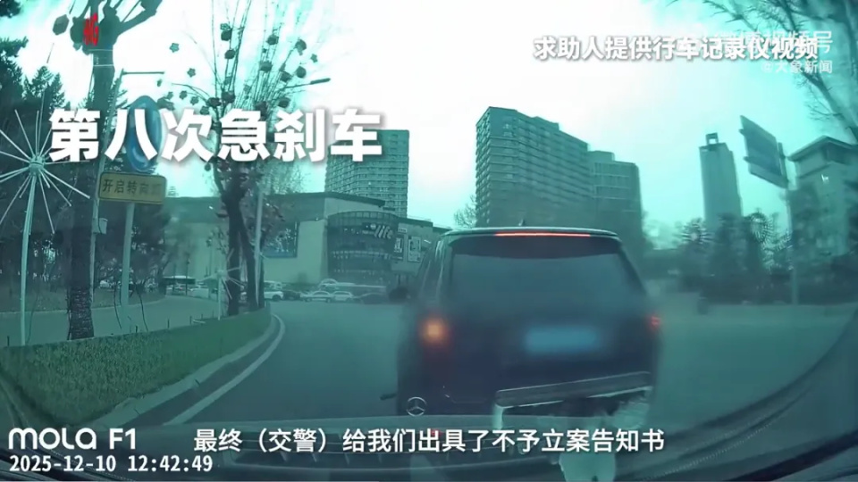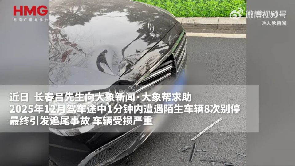 2025年12月10日,长春市民吕先生驾车行驶至朝阳区新民广场转盘时,遭一辆黑色路虎在道路畅通情况下,一分钟内连续8次急刹别停,最终追尾。